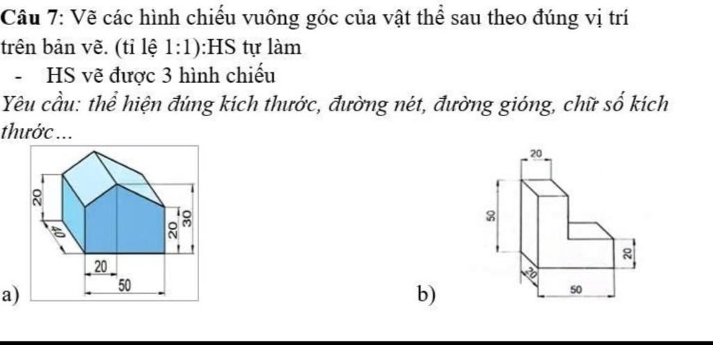 Câu 7: Vẽ các hình chiếu vuông góc của vật thể sau theo đúng vị trí