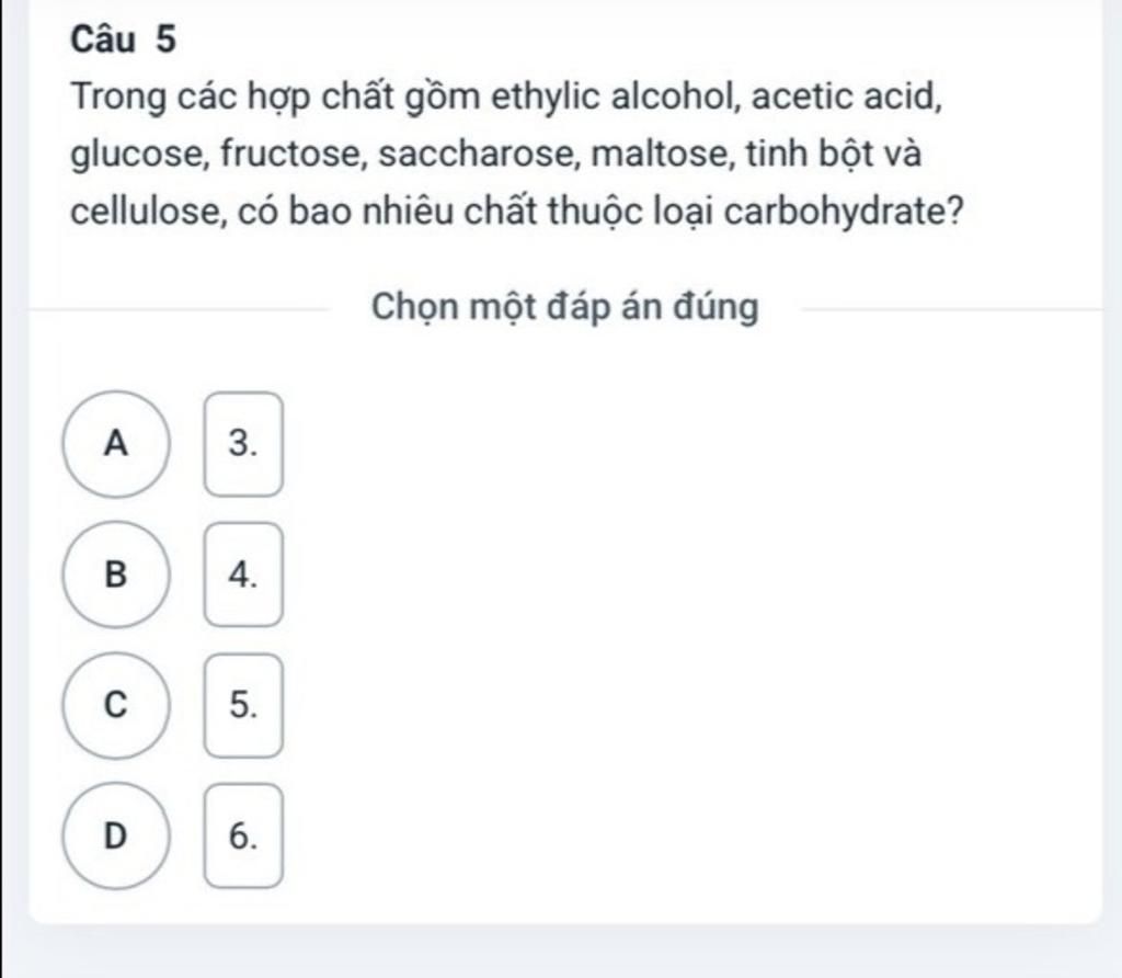 `***` Các chất thuộc loại carbohydrate: glucose, fructose, saccharose, maltose, tinh bột, cellulose.