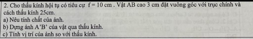 2. Cho thấu kính hội tụ có tiêu cự f= 10 cm . Vật AB cao 3 cm đặt vuông góc với trục chính và