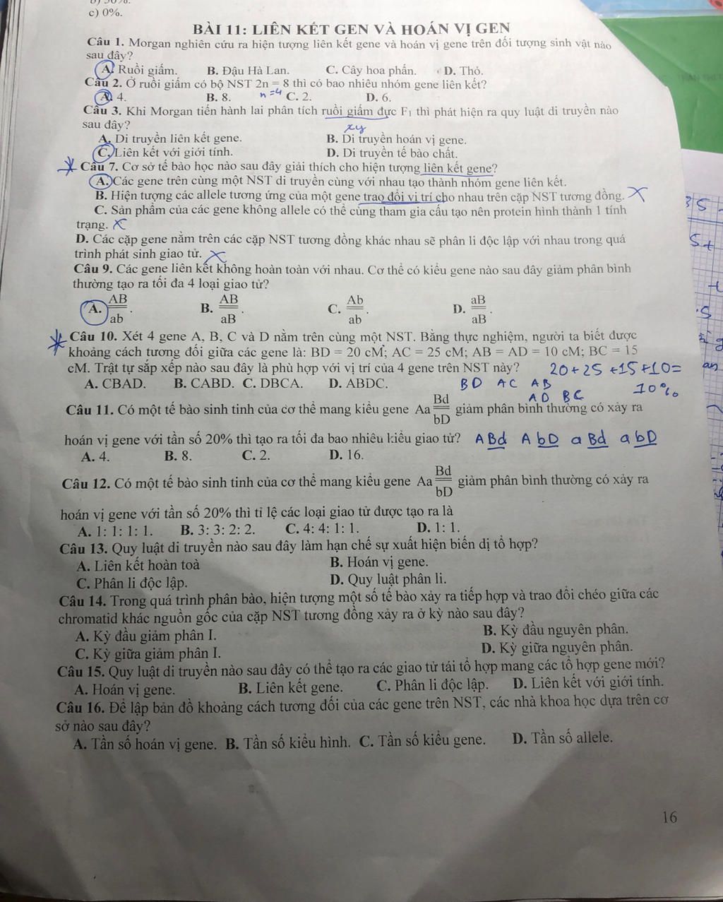 Câu 1. Morgan nghiên cứu ra hiện tượng liên kết gene và hoán vị gene trên đối tượng sinh vật nào