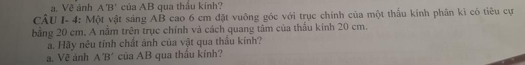 CÂU I- 4: Một vật sáng AB cao 6 cm đặt vuông góc với trục chính của một thấu kính phân kì có tiêu cự