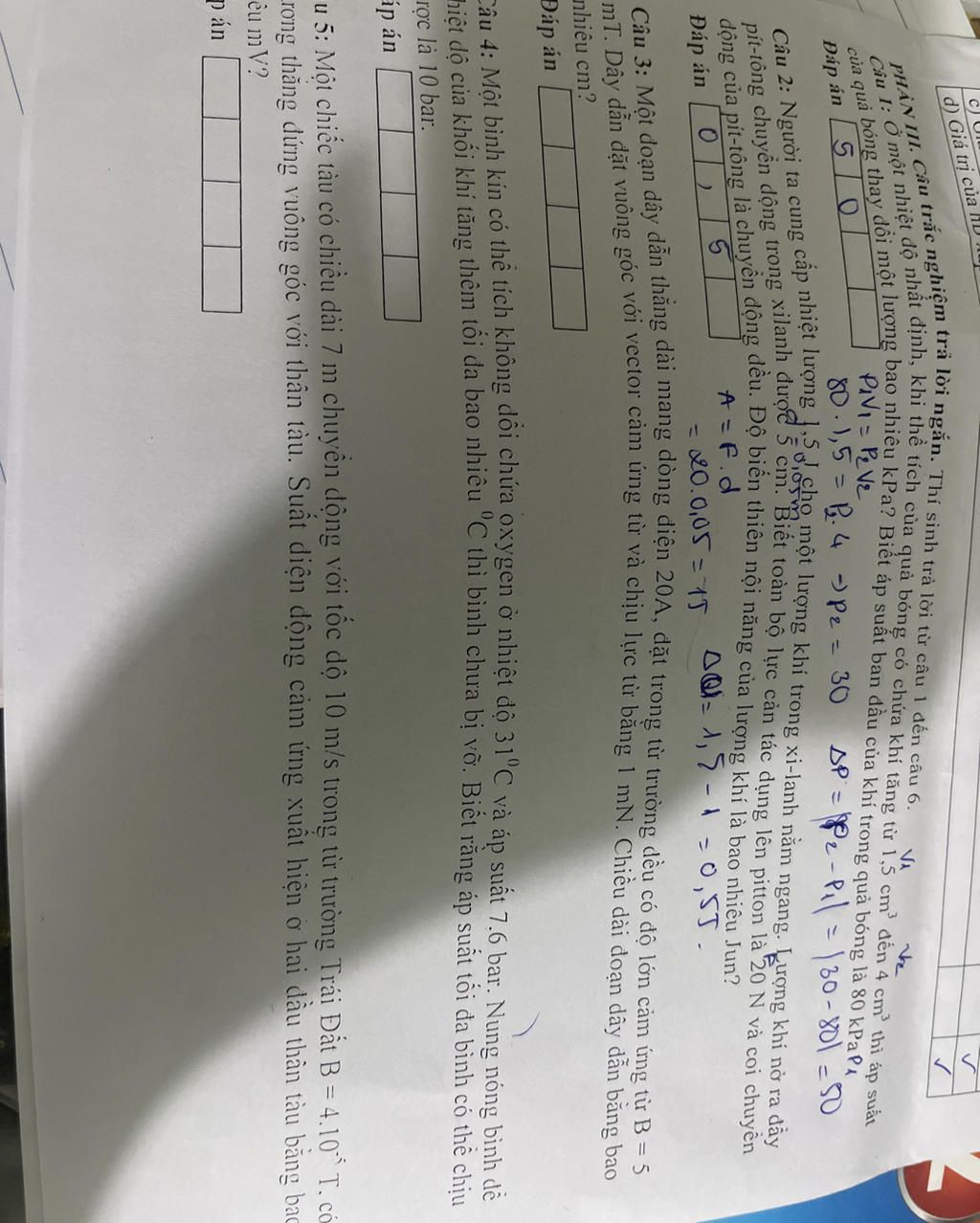 Câu 1: Ở một nhiệt độ nhất định, khi thể tích của quả bóng có chứa khí tăng từ 1,5 cm đến 4 cm thì áp suất