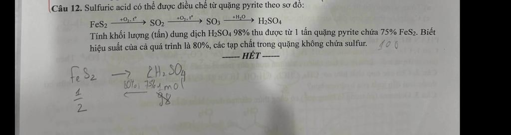 `m_(H_2SO_4) = 0,01xx98 = 0,98` (tấn) `(*` Vì ban đầu giữ nguyên đơn vị tấn `)`