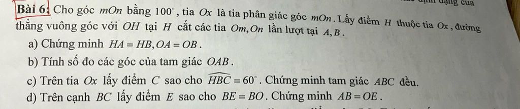 $\widehat{HOA}=\widehat{HOB}$ vì $OH$ là phân giác $\widehat{mOn}$