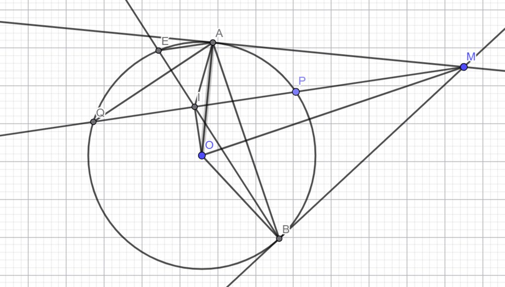 Qua điểm `M` nằm ở ngoài đường tròn `(O)` kẻ hai tiếp tuyến `MA, MB` (`A, B` là các tiếp điểm) và cát tuyến `MPQ` (`MP < MQ`). Gọi `I` là trung điểm của dây `PQ`, `E` là giao điểm thứ hai của đường thẳng `BI` và đường tròn `(O)`.
