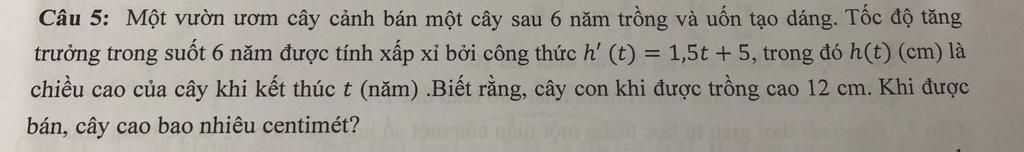 Ta có: `h'(t) = 1,5t + 5 -> h(t) = 0,75t^2 + 5t + C`.