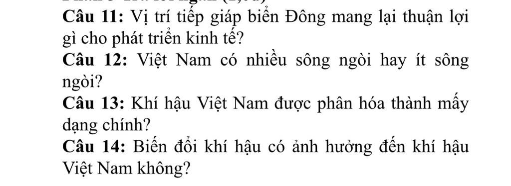 Câu 14: Có, biến đổi khí hậu tác động rất mạnh mẽ và tiêu cực đến khí hậu nước ta, thể hiện qua việc gia tăng nhiệt độ, thay đổi lượng mưa, gây ra các thời tiết cực đoan như : lũ lụt, hạn hán,... gây thiệt hại về người và kinh tế Việt Nam