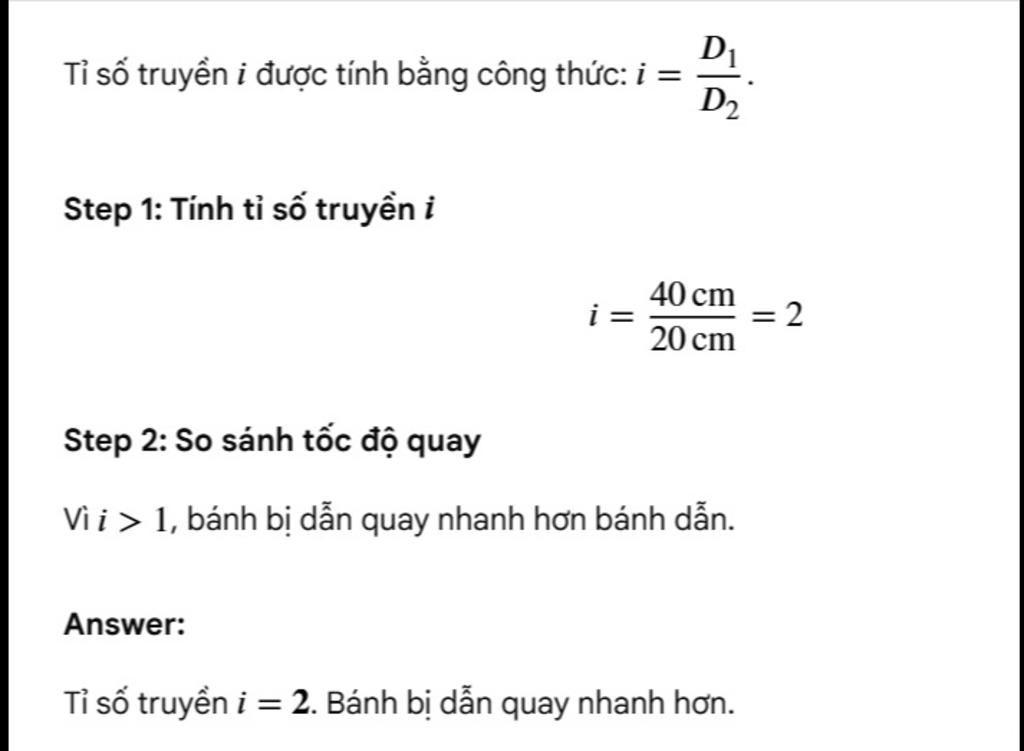 a) Với bộ truyền chuyển động đai, biết bánh dẫn đường kính 40cm, bánh bị dẫn có đường kính 20cm. Tính tí số truyền i và cho biết chi tiết nào quay nhanh hơn?