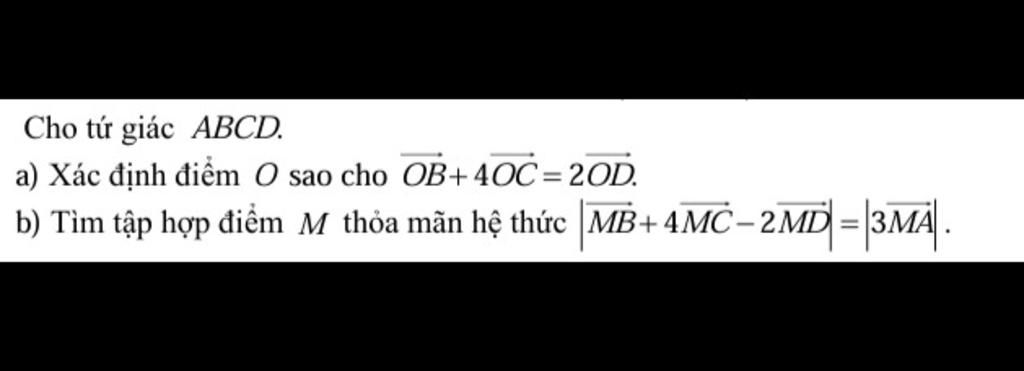 & \text{b)Với điểm } O \text{ xác định ở câu a, ta có: } \vec{OB} + 4\vec{OC} - 2\vec{OD} = \vec{0} \\