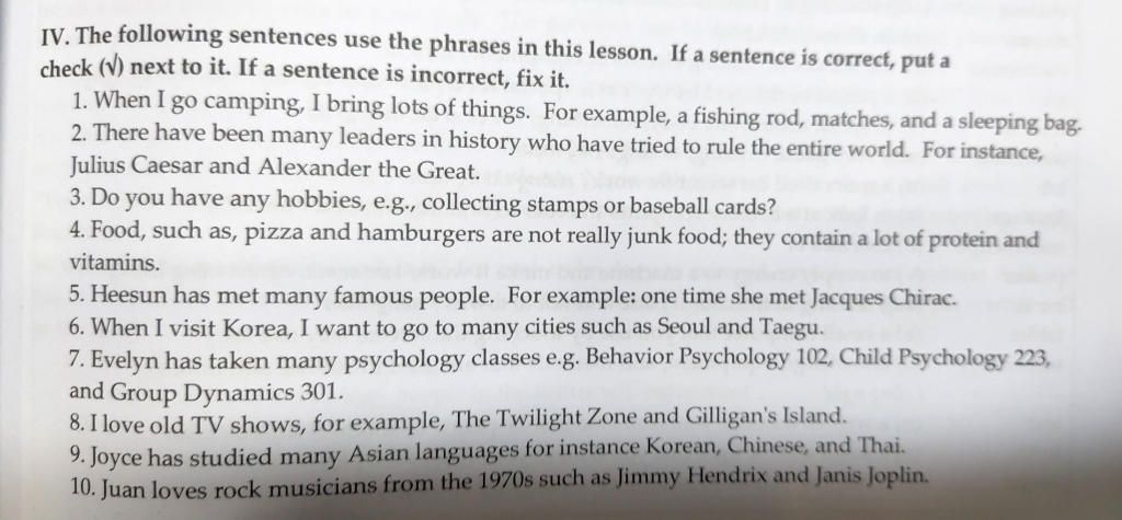 1. When I go camping, I bring lots of things. For example, a fishing rod, matches, and a sleeping bag.