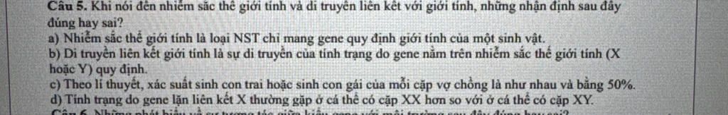 b.đúng(Hiện tượng di truyền liên kết với giới tính là hiện tượng các gen quy định tính trạng thường nằm trên nhiễm sắc thể giới tính X hoặc Y.)