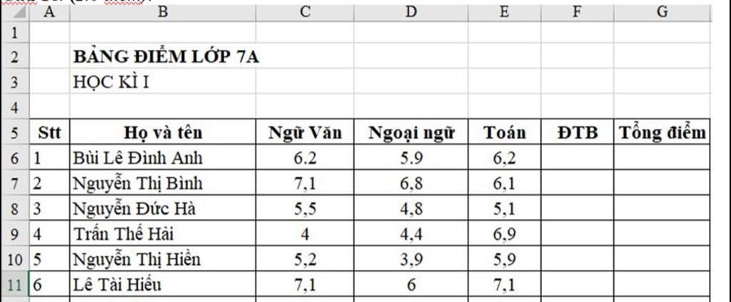 `->` Tính tổng ô `G6` là : =SUM(A7:C7)