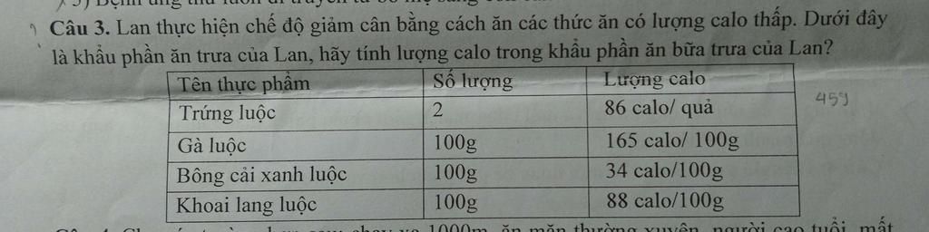 Câu 3. Lan thực hiện chế độ giảm cân bằng cách ăn các thức ăn có lượng calo thấp. Dưới đây