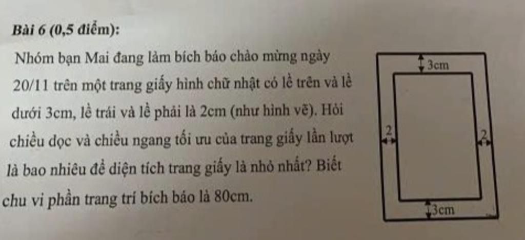 nhóm bạn Mai đang làm bích báo chào mừng ngày 20/11 trên một trang giấy hình chữ nhật có lề trên và lề dưới 3cm, lề trái và lề phải 2cm. Hỏi chiều dọc và chiều ngang tối ưu của trang giấy lần lượt là bao nhiêu để diện tích trang giấy là nhỏ nhất? Biết chu vi phần trang trí bích báo là 80cm