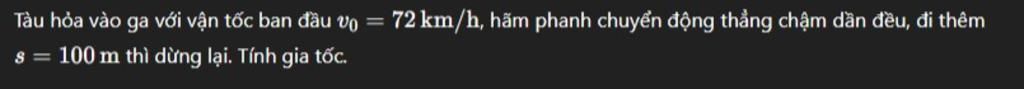 Tàu dừng lại `=> v=0 km``/h`, đổi `72 km``/h=20 m``/s`