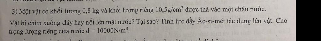3) Một vật có khối lượng 0,8 kg và khối lượng riêng 10,5g/cm3 được thả vào một chậu nước.