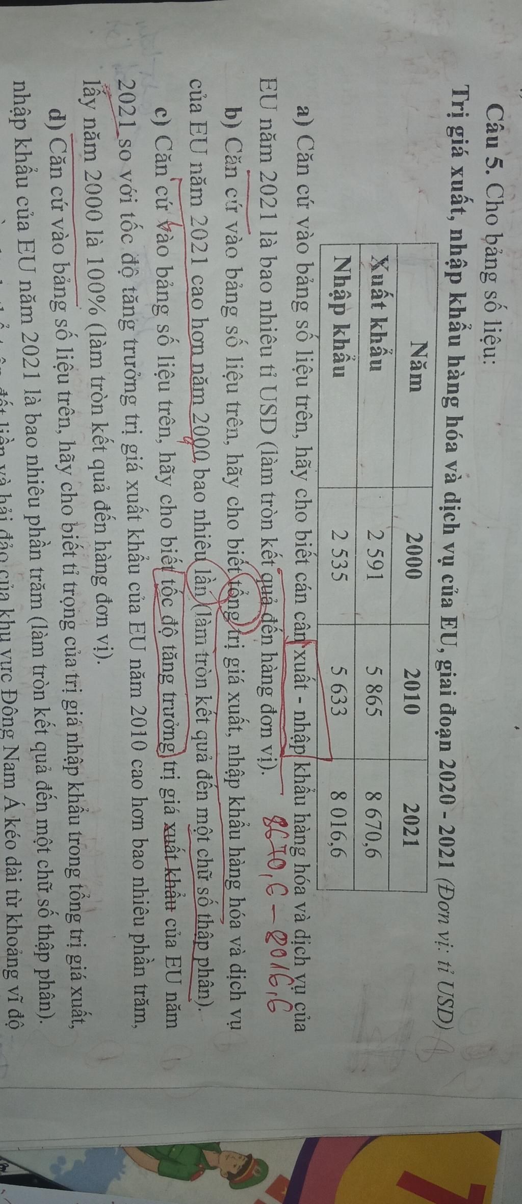 `a)` Cán cân xuất nhập khẩu của EU năm `2021`: $\qquad8670{,}6 - 8016{,}6 = 654$ (tỉ USD)$\\$ `b)` Trị giá xuất khẩu năm `2021` cao hơn năm `2000`: $\\$$\qquad\dfrac{8670{,}6}{2591} \approx 3{,}3 $ (lần) $\\$ `c)` Tốc độ tăng trưởng năm $2010$ so với $2000$: \[ \frac{5865}{2591} \times 100 \approx 226{,}4\% \] $\quad$Tốc độ tăng trưởng năm $2021$ so với $2000$: \[ \frac{8670{,}6}{2591} \times 100 \approx 334{,}6\% \] Tốc độ tăng trưởng giá trị xuất khẩu của EU năm `2021` so với năm `2010` cao hơn : \[ 334{,}6 - 226{,}4 \approx 108\% \] $\\$`d)` Tốc độ tăng trưởng trị giá xuất khẩu năm `2021`: \[ \frac{8670{,}6}{2591} \times 100 \approx 334{,}6\% \]