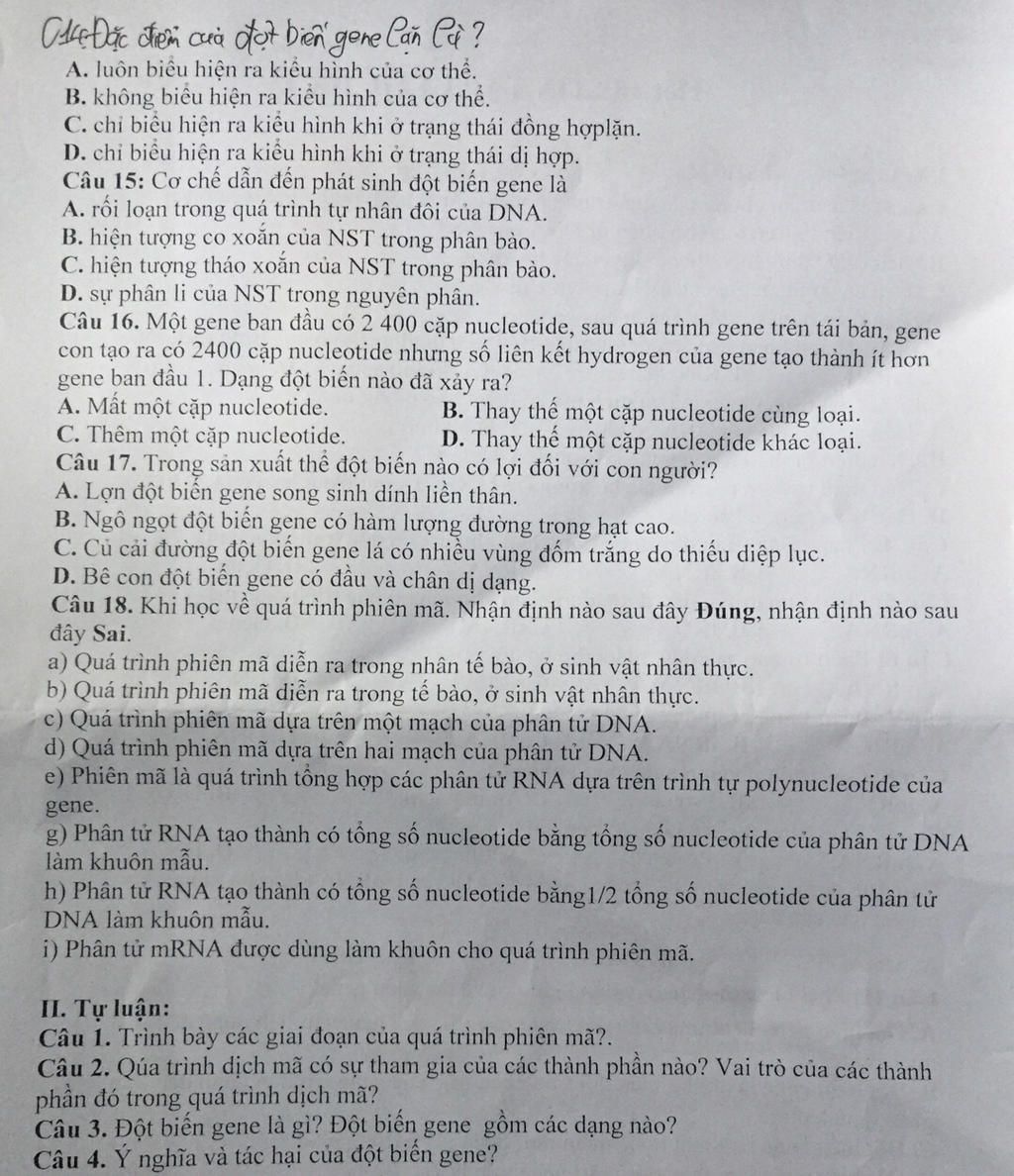 Câu 15: Cơ chế dẫn đến phát sinh đột biến ...