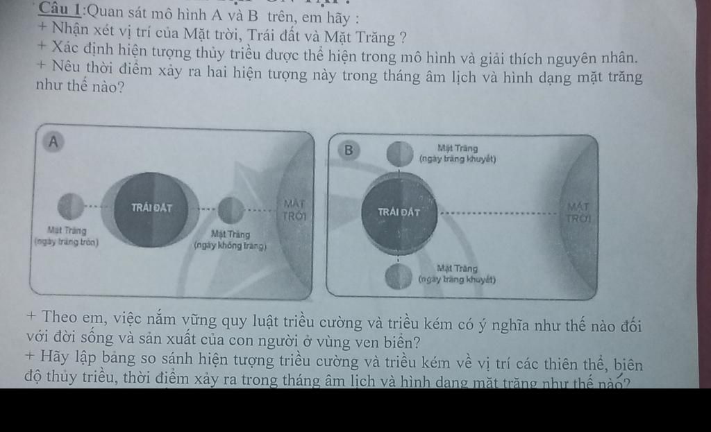 Mô hình B : Mặt trời , mặt trăng và trái đất tạo thành 1 góc vuông tại tâm trái đất điều này xảy ra khi mặt trăng ở vị trí trăng khuyết ở đầu tháng hoặc cuối tháng