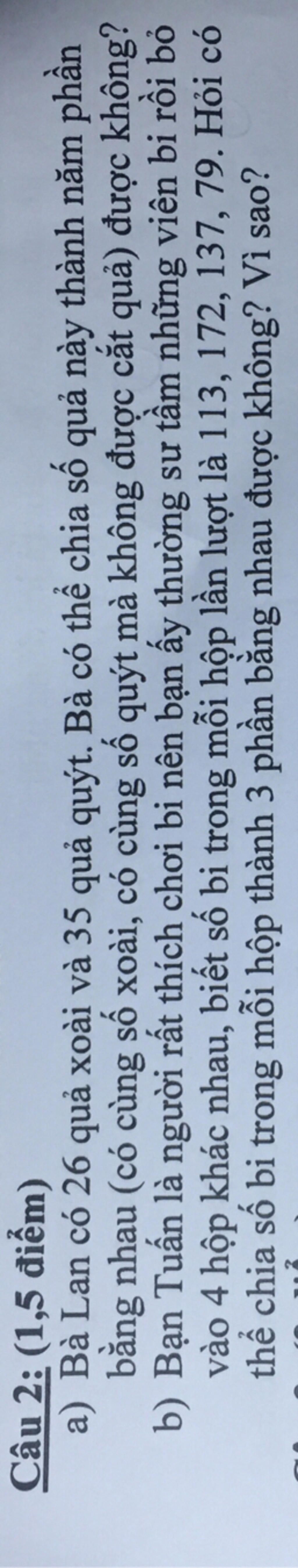 `=>`Bà Lan không thể chia số quả này thành năm phần bằng nhau vì số quả xoài không chia hết cho `5`