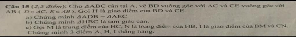 Câu 15 (2.5 điểm): Cho AABC cân tại A, vẽ BD vuông góc với AC và CE vuông góc với