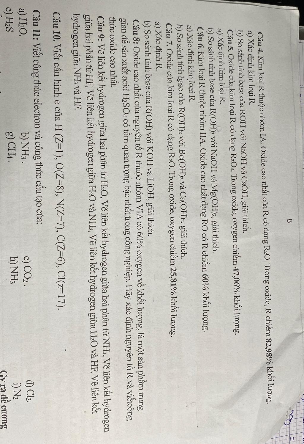 Câu 4. Kim loại R thuộc nhóm IA. Oxide cao nhất của R có dạng R2O. Trong oxide, R chiếm 82,98% khối lượng.
