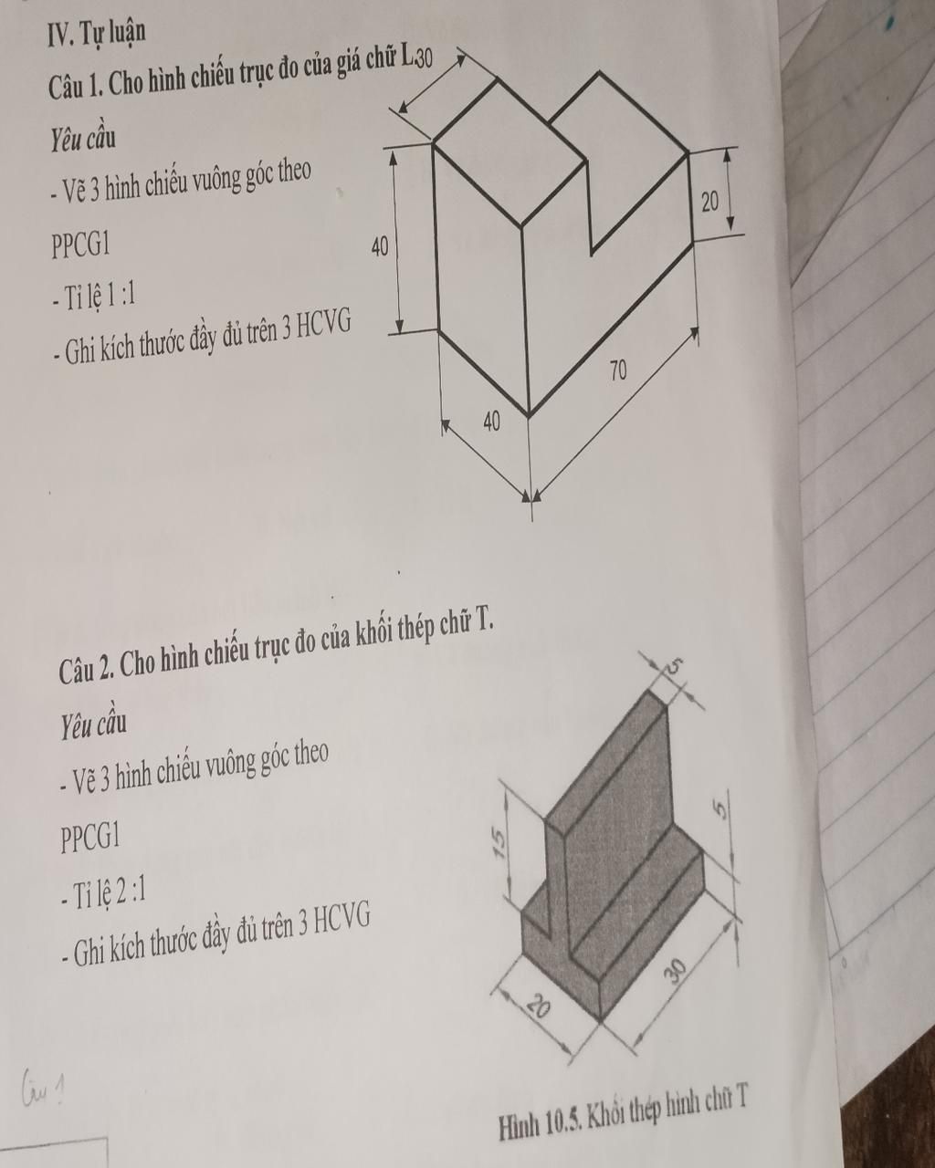 Câu 2. Cho hình chiếu trục đo của khối thép chữ T.
