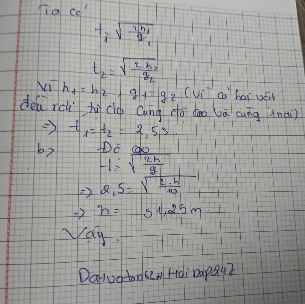 a) Nếu vật m1 rơi tới đất trong 2,5s thì vật m2 rơi tới đất trong thời gian bao nhiêu giây?