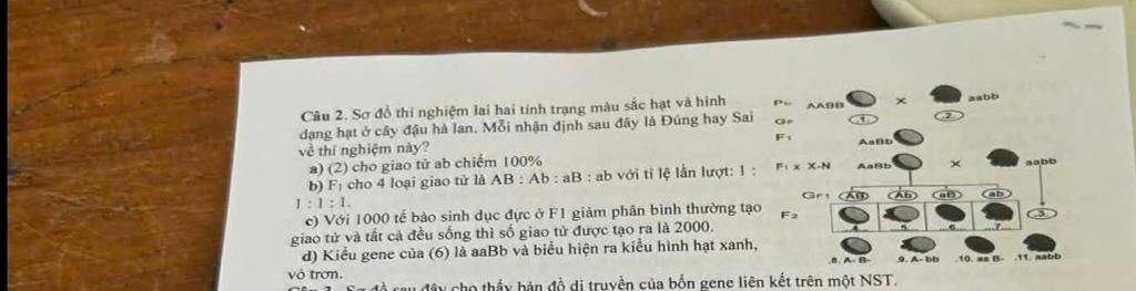 a) Đúng (aabb → chỉ cho giao tử ab 100%) b) Đúng (F₁ AaBb → AB : Ab : aB : ab = 1 : 1 : 1 : 1) c) Sai (1000 TB sinh dục đực → 4000 giao tử, không phải 2000) d) Đúng (aaBb → hạt xanh, vỏ trơn)