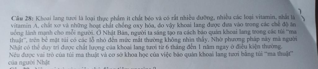 Câu 28: Khoai lang tươi là loại thực phẩm ít chất béo và có rất nhiều dưỡng, nhiều các loại vitamin, nhất là