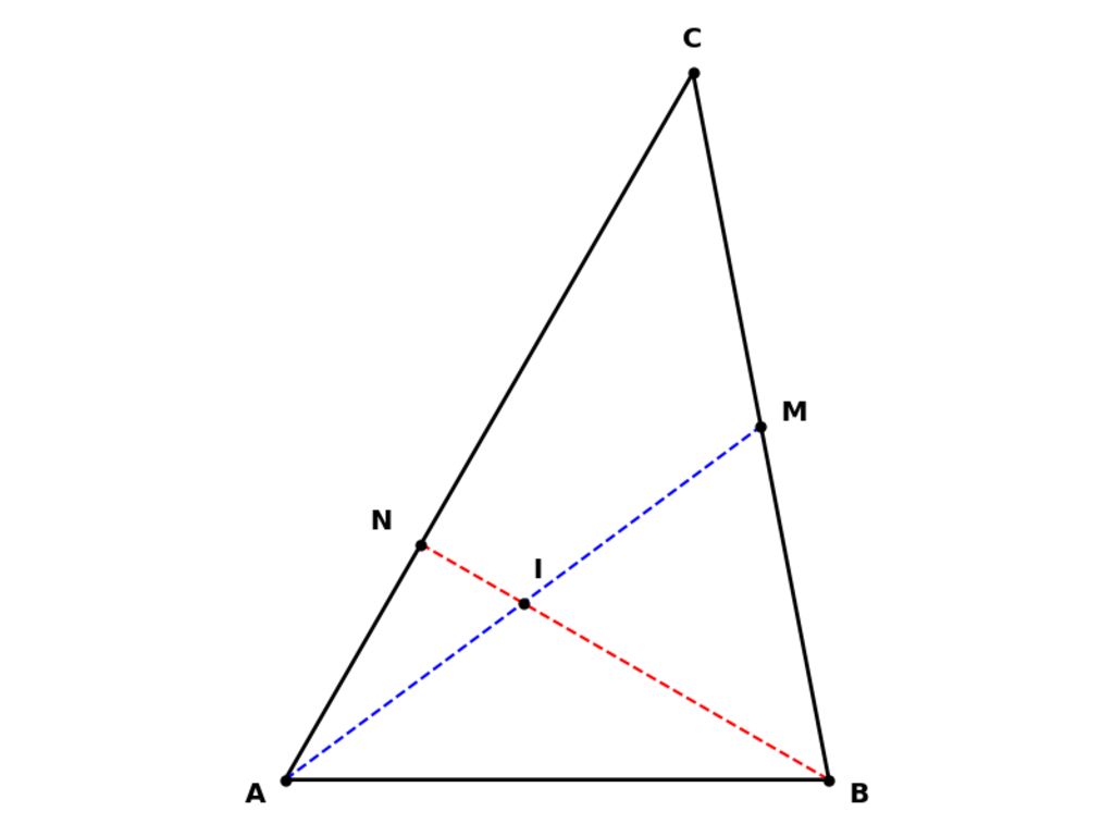 $\Leftrightarrow \overrightarrow{AI} = \overrightarrow{BI} +\overrightarrow{AB} = x\overrightarrow{AN} + (1 - x)\overrightarrow{AB} (2)$