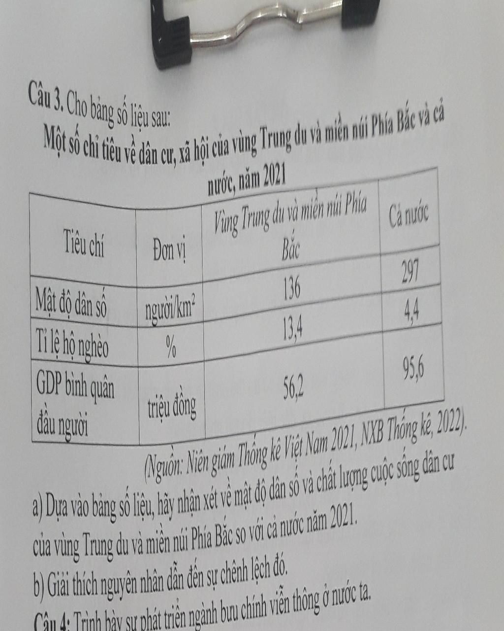 Câu 3. Cho bảng số liệu