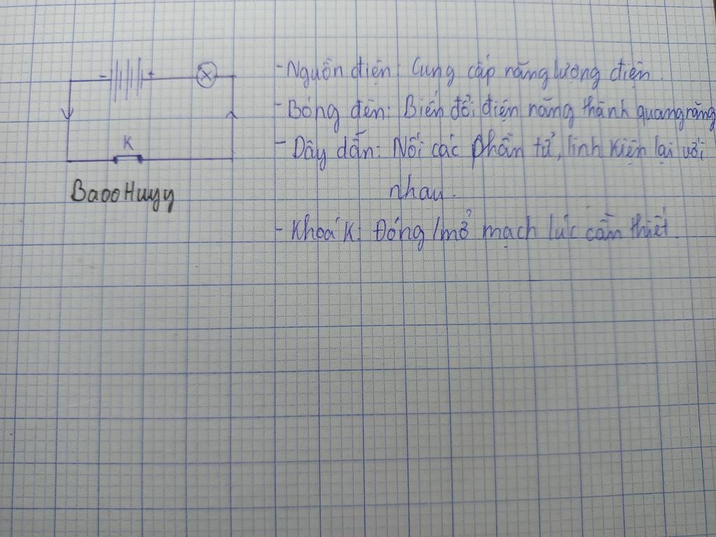vẽ sơ đồ mạch điện đơn giản gồm : 3 nguồn điện (pin) mắc nối tiếp , 1bóng đèn ,1 công tắc và vẽ chiều dòng điện trong mạch khi công tắc đóng ? Nêu vai trò các phân tử của mạch điện