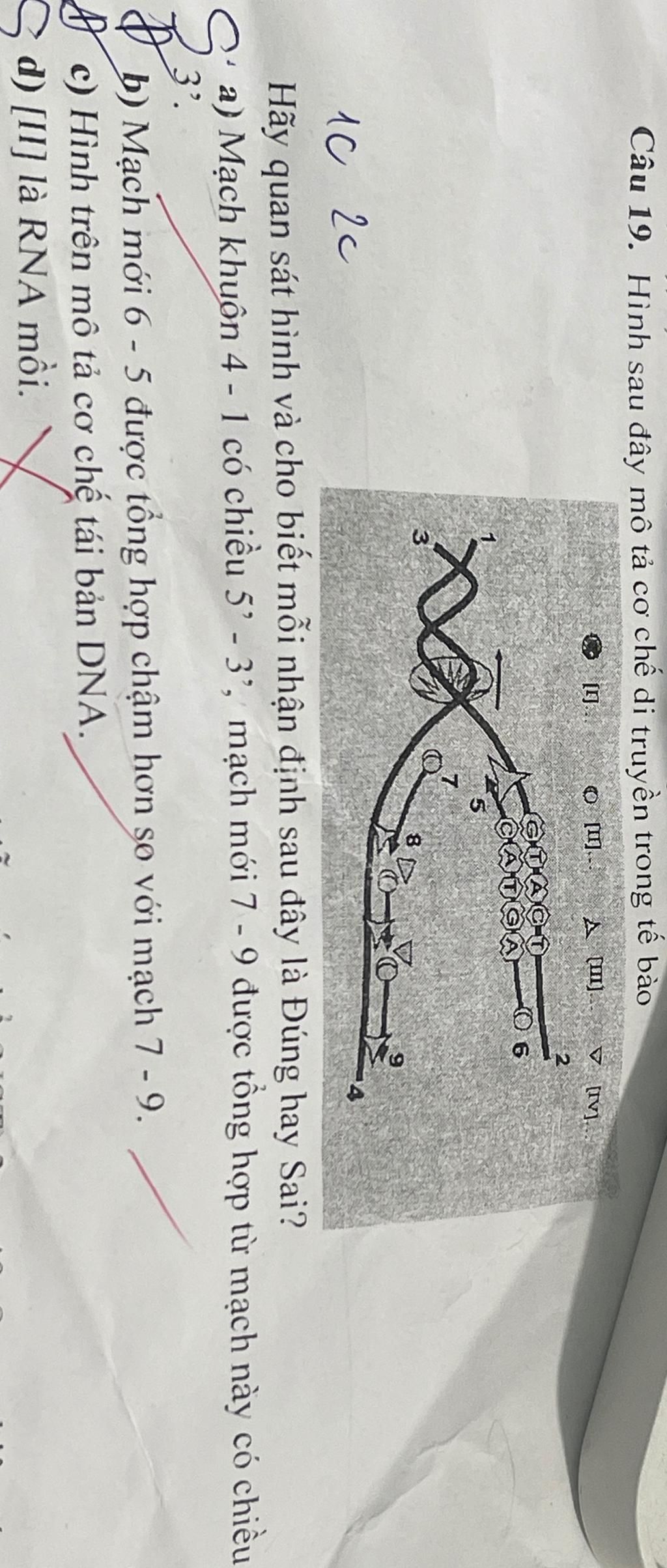 a) Mạch khuôn 4 - 1 có chiều 5’ - 3’, mạch mới 7 - 9 được tổng hợp từ mạch này có chiều