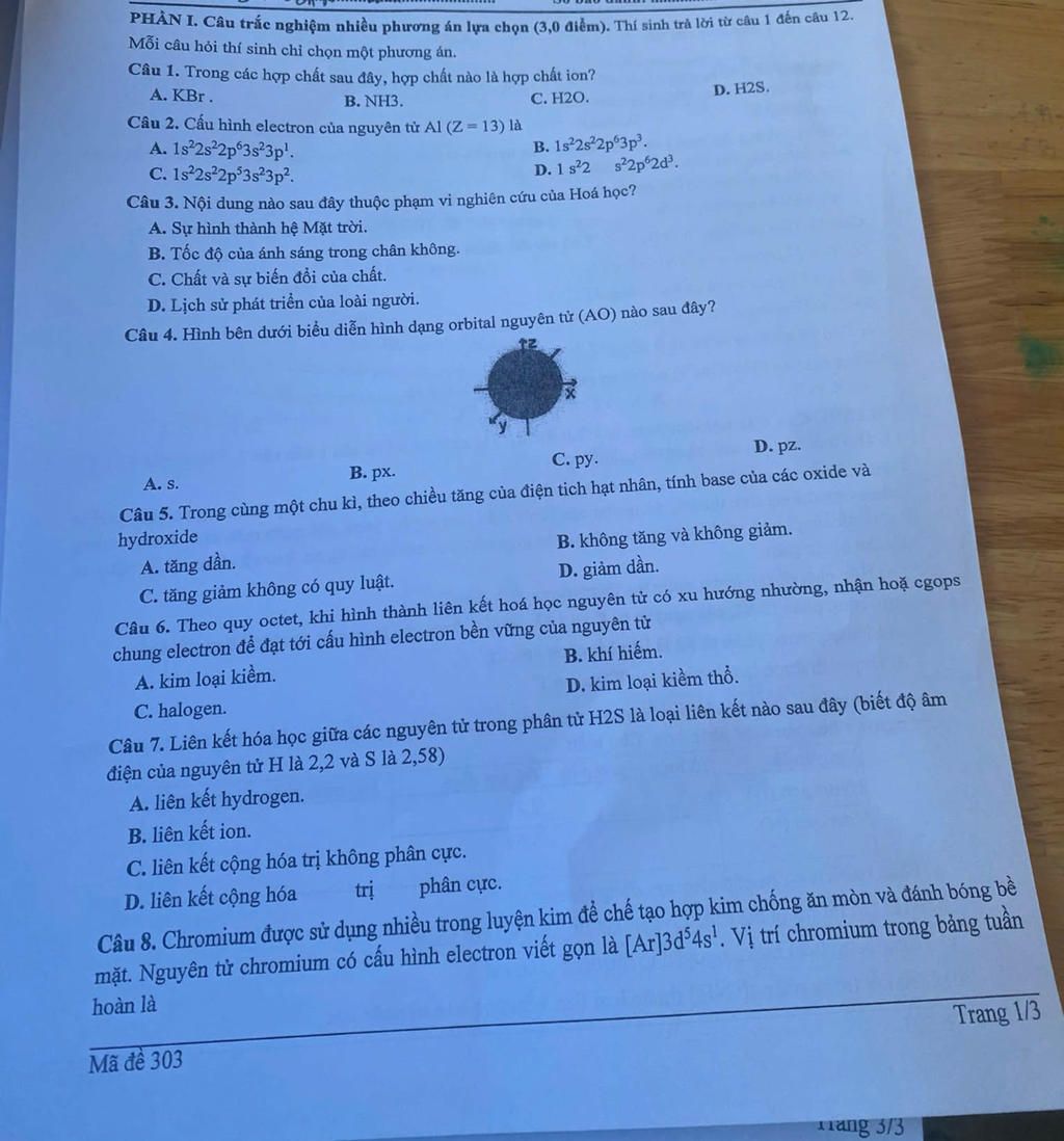 Câu 2. Cấu hình electron của nguyên tử Al (Z = 13) là