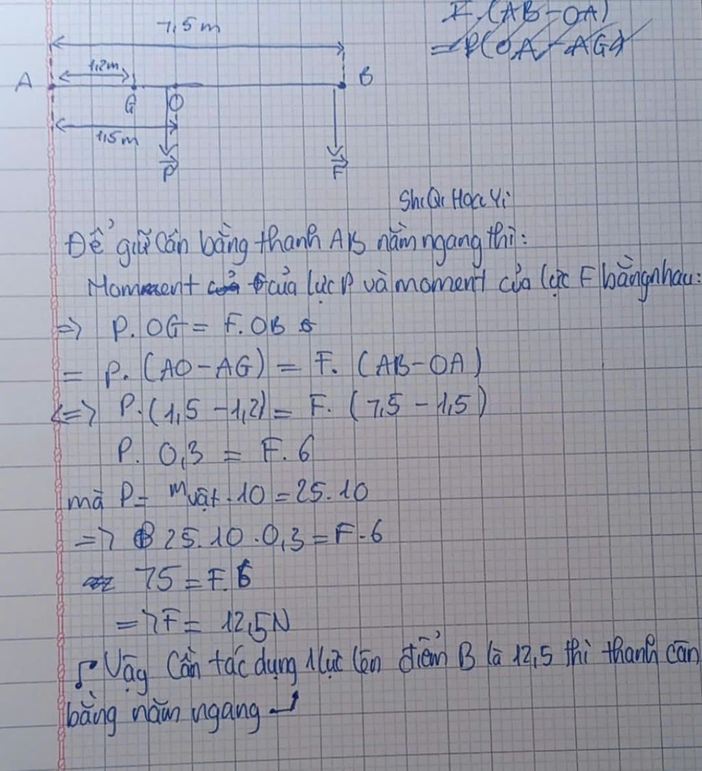 một thanh chắn đường AB dài 7,5m; có khối lượng 25kg, có trọng tâm G cách đầu A là 1,2m.Thanh có thể quay quanh một trục O nằm ngang cách đầu A là 1,5m.Để giữ thanh cân bằng nằm ngang thì phải tác dụng lên đầu B một lực bằng bao nhiêu?