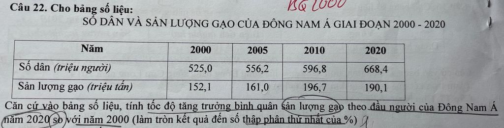 Tốc độ tăng trưởng bình quân sản lượng gạo theo đầu người của Đông Nam Á năm $2020$ so với năm $2000$: \[ \left( \dfrac{\dfrac{190{,}1\times10^3}{ 668{,}4}}{\dfrac{152{,}1\times10^3 }{ 525{,}0}} - 1 \right) \times 100\approx-1,8\% \]