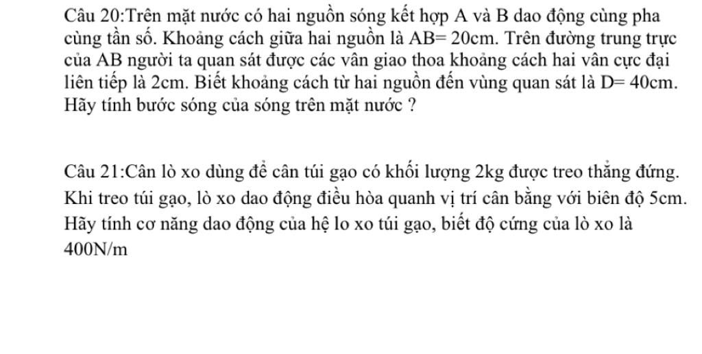 Câu 20:Trên mặt nước có hai nguồn sóng kết hợp A và B dao động cùng pha