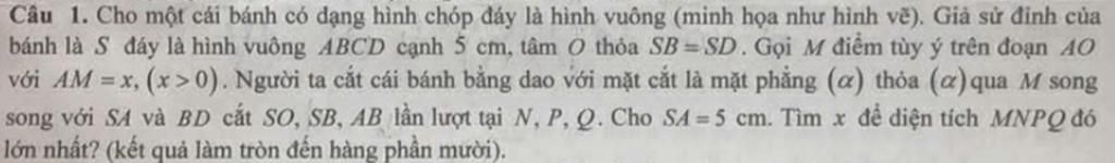 Câu 1. Cho một cái bánh có dạng hình chóp đáy là hình vuông (minh họa như hình vẽ). Giả sử đỉnh của
