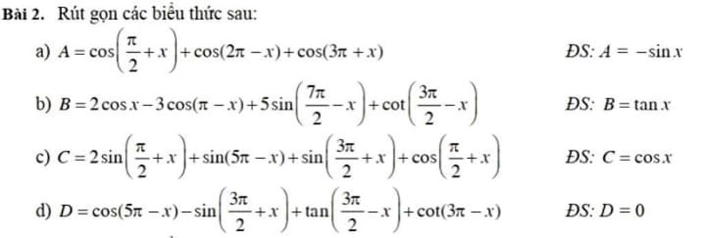 D = \cos \left( {5\pi - x} \right) - \sin \left( {\frac{{3\pi }}{2} + x} \right) + \tan \left( {\frac{{3\pi }}{2} - x} \right) + \cot \left( {3\pi - x} \right)\\
