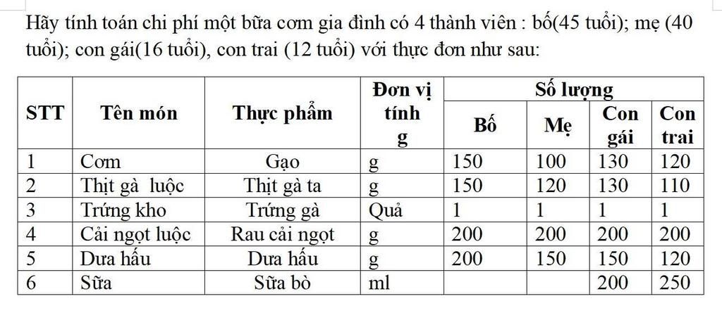 Gạo: `120g -> 0.12kg xx 15.000 = 1.800đ`