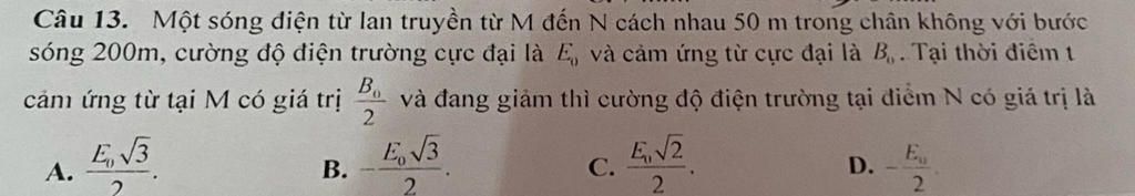 \({E_N}\) nhanh pha hơn \({E_M}\) là \(\dfrac{\pi }{2}\left( {rad} \right)\)