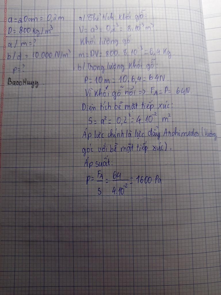 Khối gỗ hình lập phương có cạnh A bằng 20 cm biết khối lượng riêng bằng 800 kg³