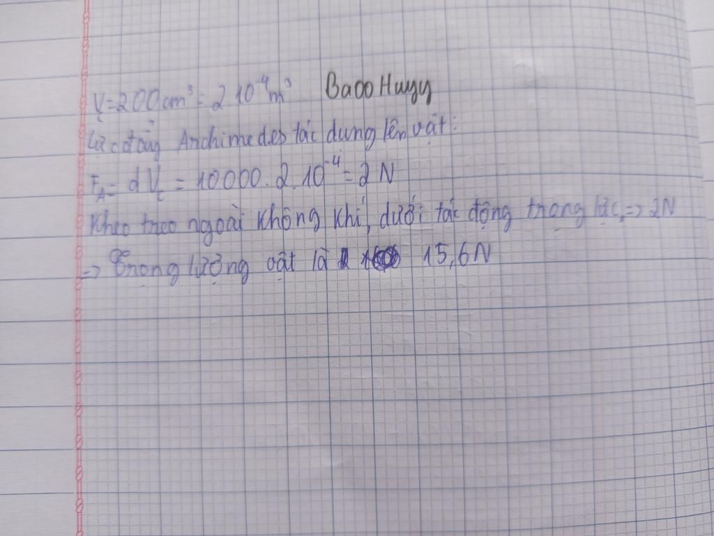 Vậy lực đẩy Achimedes tác dụng lên vật là 2 N và trọng lượng của vật là 15,6 N.