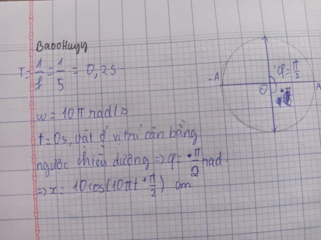 Xét 1 vật dao động điều hòa có biên độ 10cm, tần số 5Hz. Tại thời điểm ban đầu t=0 vật qua vị trí cân bằng ngược chiều dương