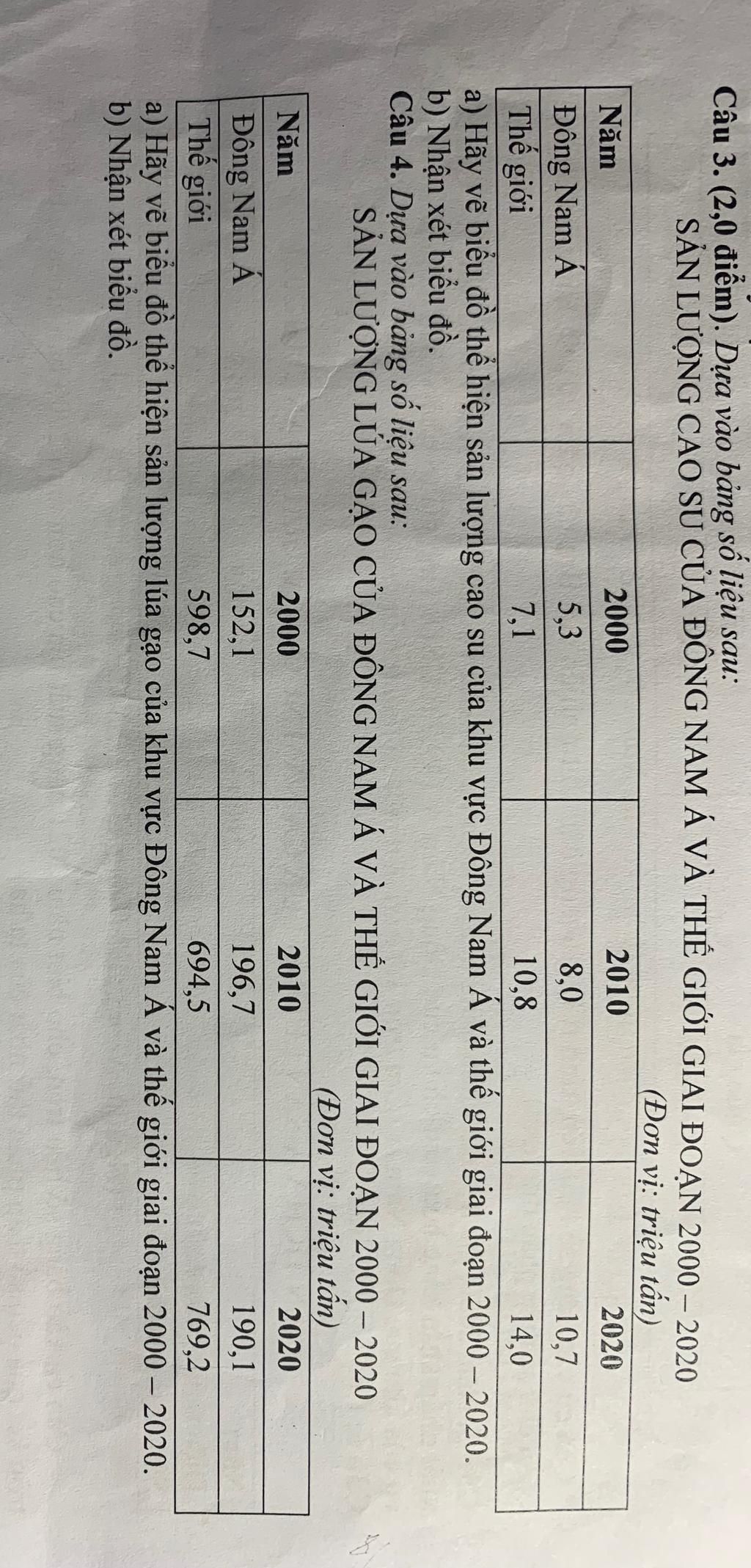 a) Hãy vẽ biểu đồ thể hiện sản lượng cao su của khu vực Đông Nam Á và thế giới giai đoạn ...