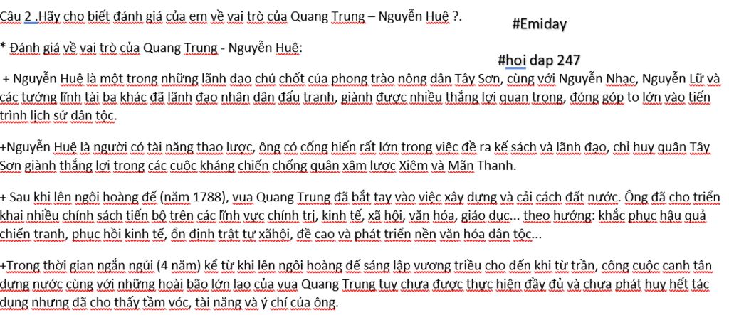 Đánh giá vai trò của Nguyễn Huệ - Quang Trung trong phong trào Tây Sơn và trong lịch sử dân tộc?