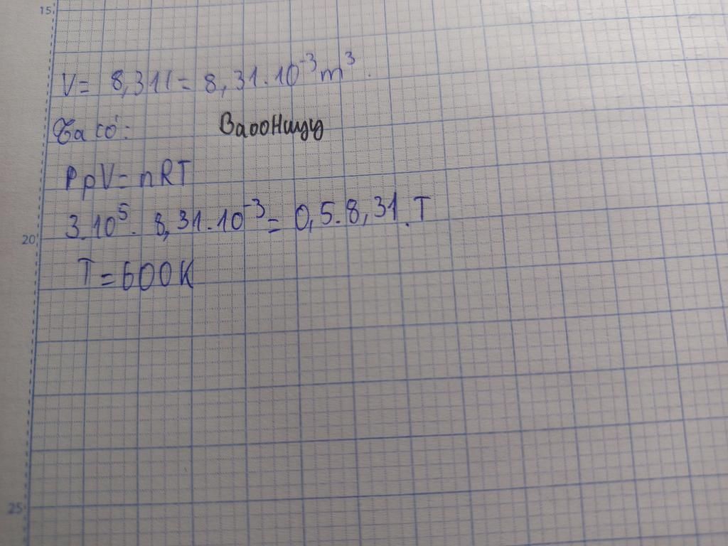 $P \cdot V = n \cdot R \cdot T$ `=>` `T = \frac{P \cdot V}{n \cdot R}` `=> ` `T = \frac{(3 \cdot 10^5) \cdot (8,31 \cdot 10^{-3})}{0,5 \cdot 8,31}` `=>``T = \frac{3 \cdot 10^5 \cdot 10^{-3}}{0,5} = \frac{3 \cdot 10^2}{0,5} = \frac{300}{0,5}` `=> T = 600 \ (K)`