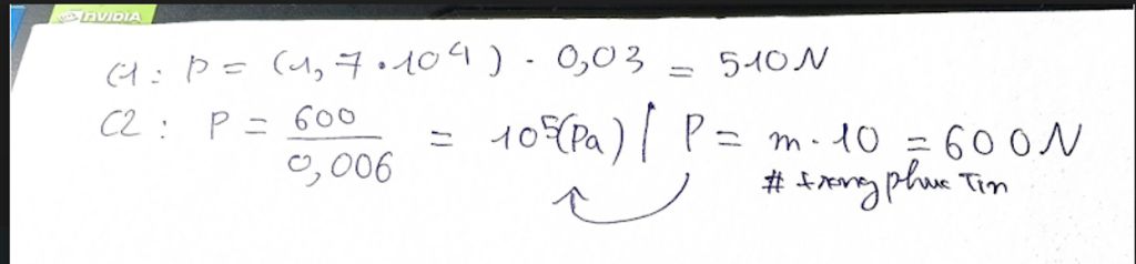 Câu 1: Một người tác dụng lên mặt sàn áp suất 1,7.10^4N/m². Diện tích của bàn chân tiếp xúc với mặt sàn là 0,03m². Trọng lượng của người đó là ?