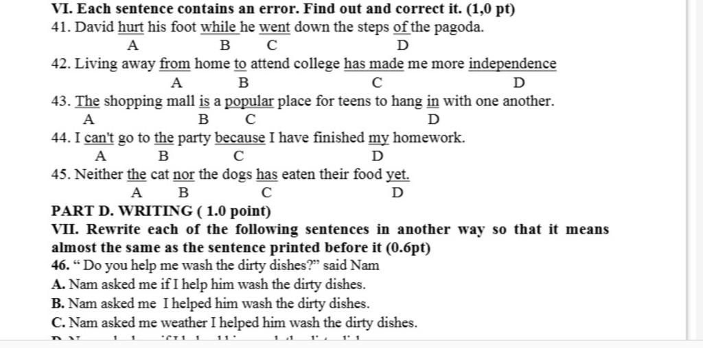 46. D (Nam asked me if I helped him wash the dirty dishes.)